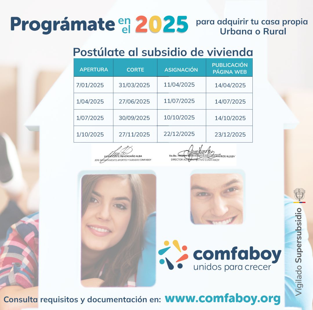 🏢 En todas las sedes de COMFABOY podrán presentarse postulaciones de manera presencial de lunes a viernes, en el horario de 8:00 a.m. a 6:00 p.m. excepto el día 27 de noviembre de 2025 que será 8:00 a.m. a 12:00 a.m.